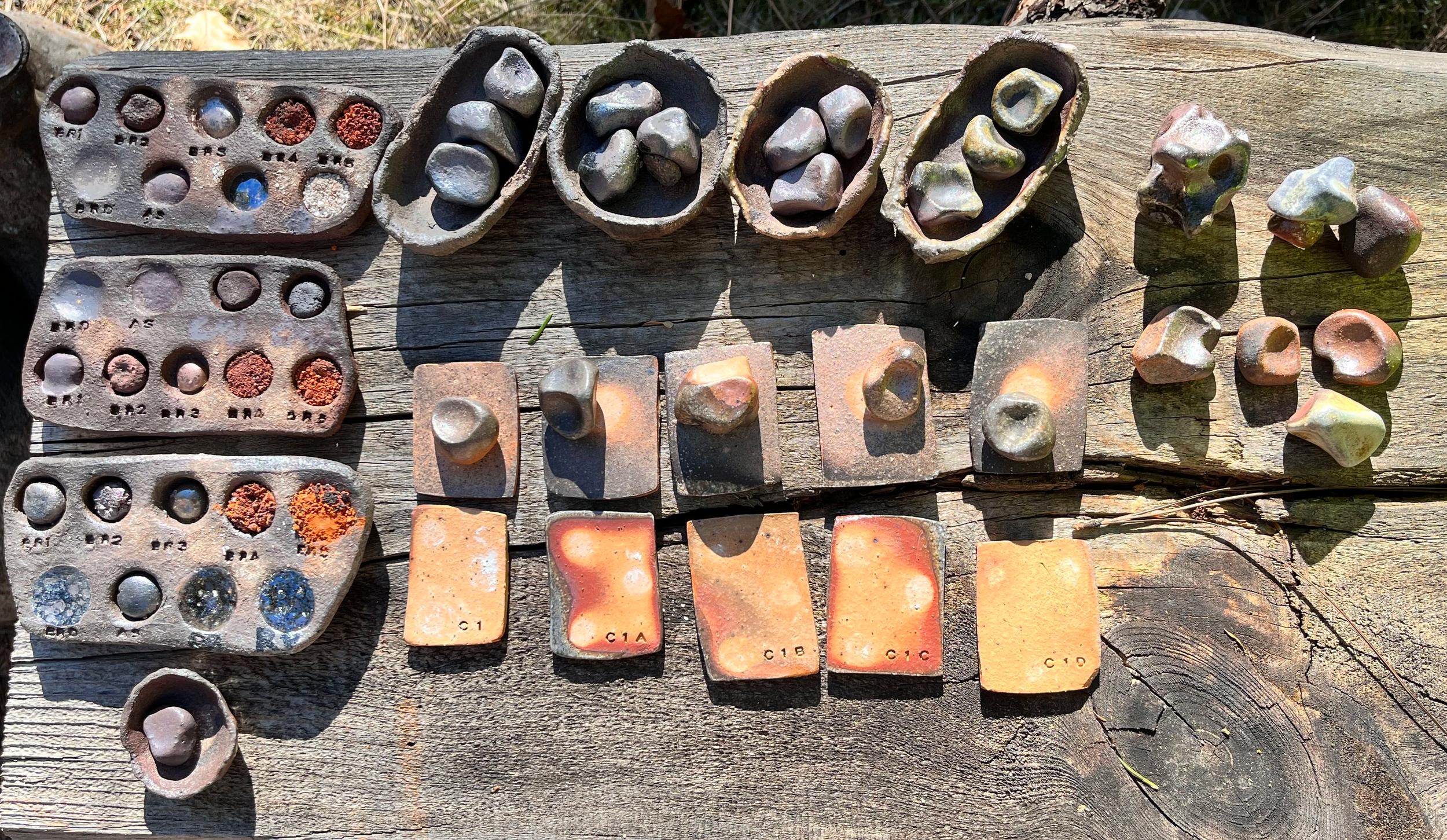 The button tests with wild clays/materials gave me some good information. I am particularly interested in testing more of “BR3” — what I believe to be volcanic ash collected along Bottle Rock Road — as a flux substitute. At this point I have so many raw materials to work with (have collected even more since this firing, hahaha), and haven’t done much actual processing or glaze/claybody formulation with them. And I’m not sure when I’ll get around to that. Just been so focused on making work, selling it, buying more clay/kiln space with that money, and then making more. But, the information I got from my tiles and line blend with the stoneware recipe I’m testing + the Bottle Rock Road “ditch clay” (“BRD”) was useful. I plan to soon make a batch of the final recipe I’ve decided on, and wedge some of it up with ~1/3 part of the wild clay. I feel like I’ve only scratched the surface with this testing, mostly because I have had to spend most of my studio time making, and clay formulation/wild material processing is so tedious and a gamble of time. But regardless I enjoy the process and this was cool information.