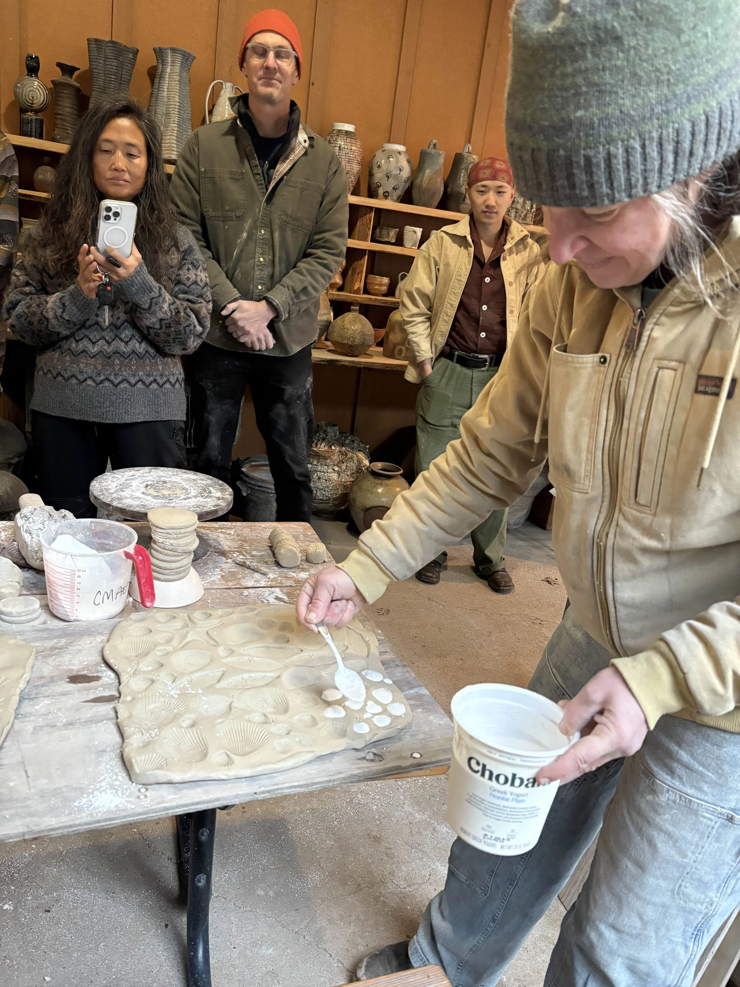 I can’t put into words how thrilled and lucky I felt for Tara Wilson to be here! She came as a guest artist to lead the train firing. I’ve admired Tara’s work for years, and she is a big reason I became interested in wood firing. Getting to know her a little and hear more about her process was amazing. She has a really unique approach to wadding where she makes press molds with actual shells then fills them with a plaster-whiting mixture to then use as substitutes to real shells in the firing. I’d never seen this method before and couldn’t believe how similar (and better, tbh) the flashing marks were to real shells.