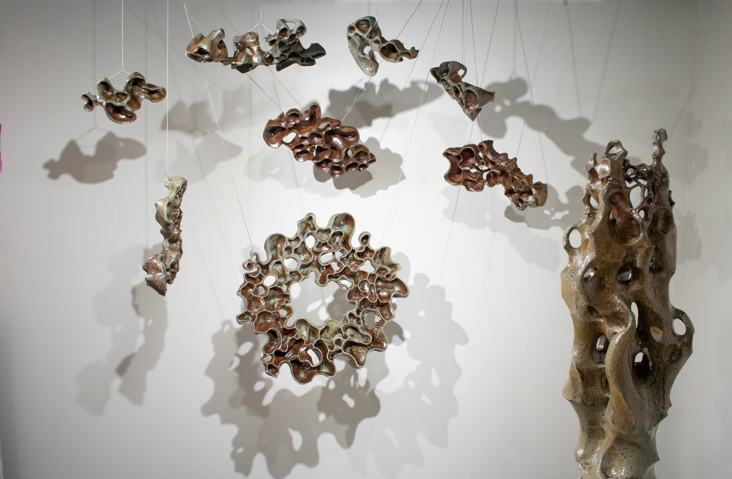 I also received critiques about my wire cables being too mechanical/industrial juxtaposed to my forms. I’ll need to find a way to tone them back in future installs, either with paint or some sort of casing. I also found out that I could’ve hung them from a wider grid, higher up in the Spacelab ceiling space, instead of the two crossbars that I hung the majority of them from. That way, they could’ve been suspended in the center of the space so that viewers could see them from all angles and not just the “front”. I feel a little stupid for not figuring that out on my own, but at least now I know. GH has suggested that I make my own grid for suspending work, and I think eventually I’ll do this, so I can show these pieces in various gallery spaces without worrying about having to adapt to their grids/ceilings.