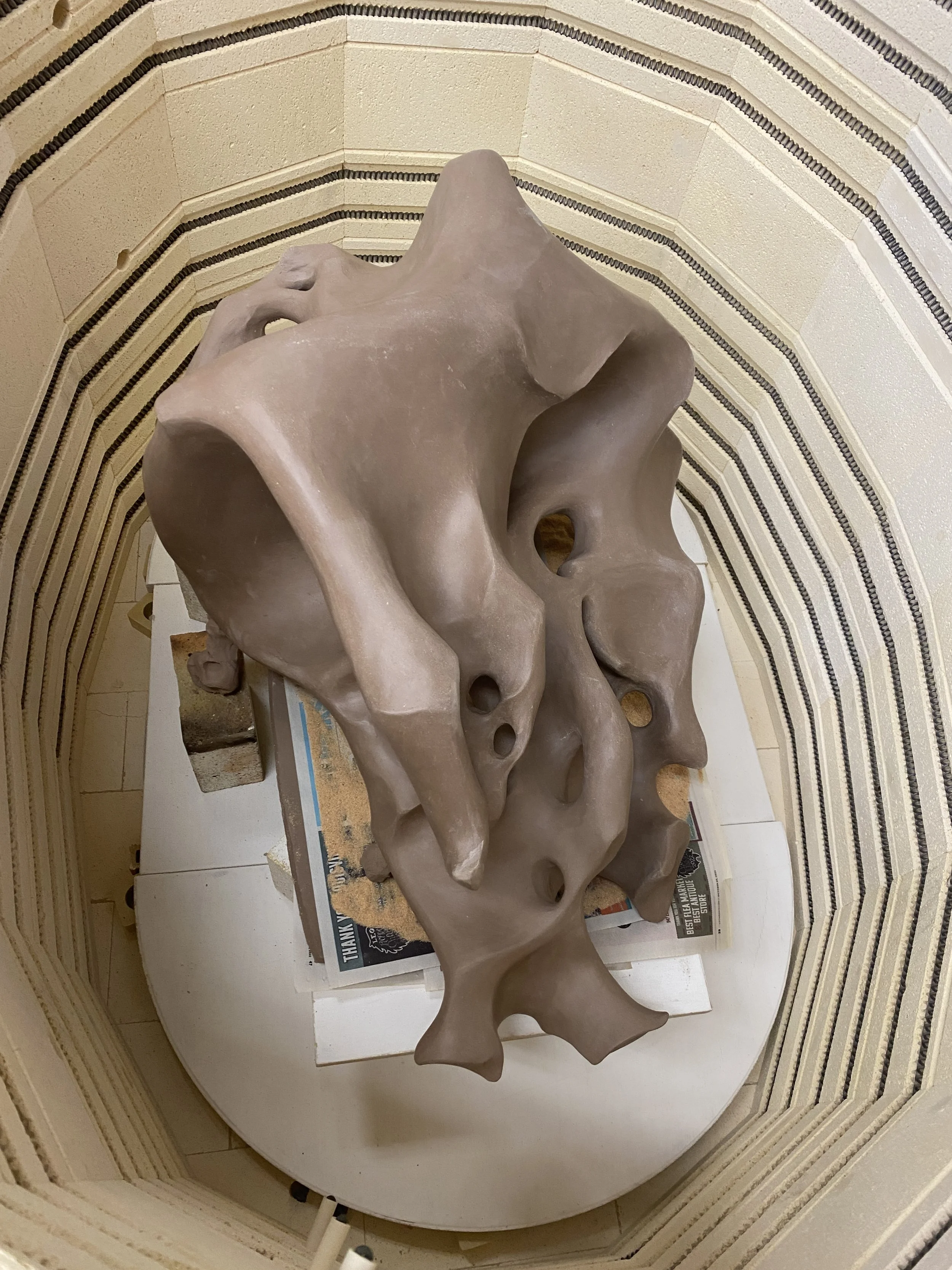 With GH’s help, I loaded my big guy into CC (the big oval electric kiln). It was stressful. My former mentor and professor recommended I try out kaowool as padding for my sculptures in the bisque, which I will definitely try next time I fire one on its side like this guy. I didn’t feel comfortable firing it on its tripod base because I built it upside down and didn’t think it could support its own weight. I really hope it makes it out okay. There was a small rehydration crack on one of its legs that I patched up, but other than that, I have high hopes and low expectations in the crack department. It’s slow drying under plastic in this kiln until I feel it’s ready for a slow bisque.