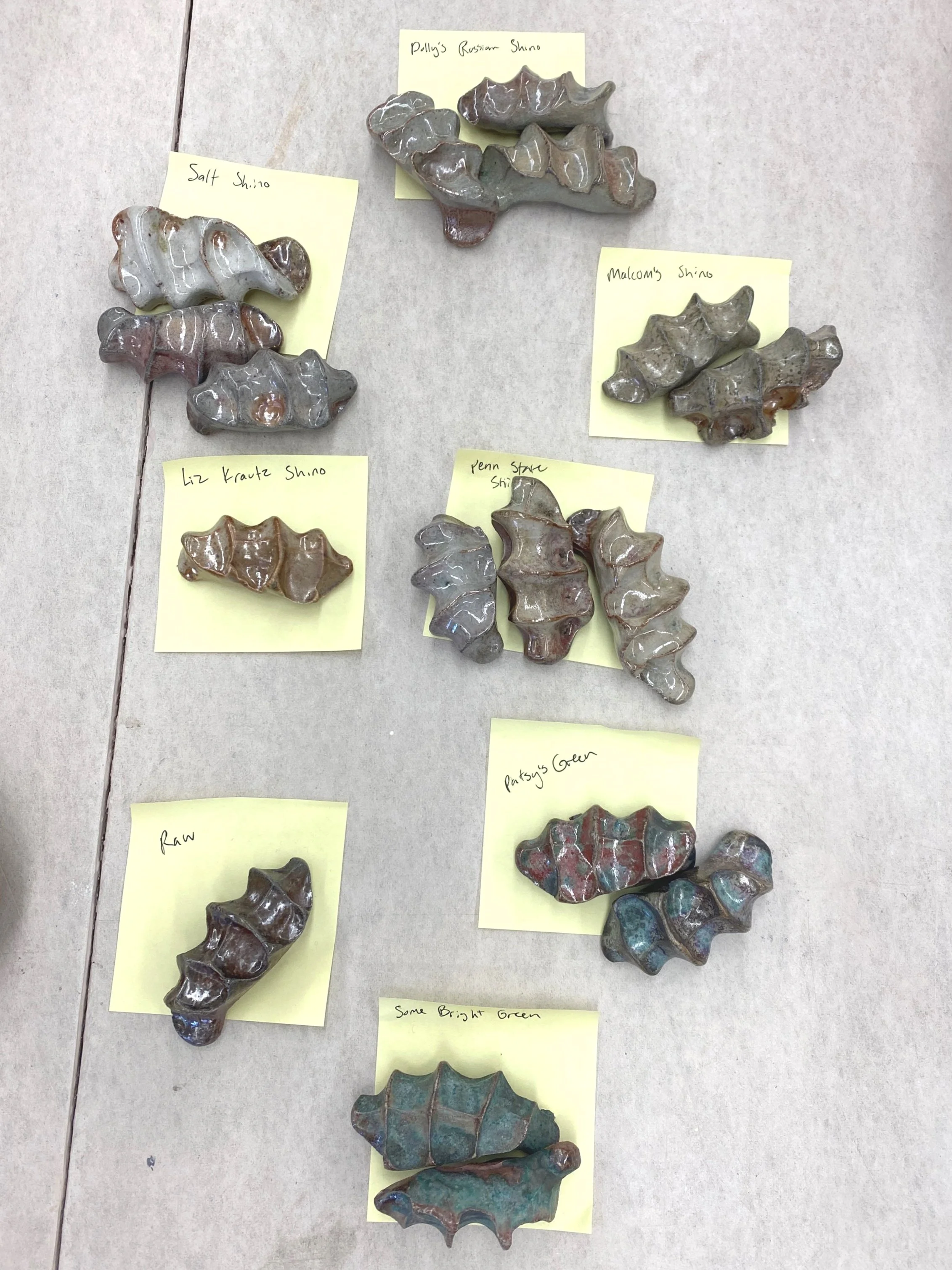 I started off the week with my first in-progress critique! The critique went well, and I got some really good honest feedback from my peers and professor. My glaze tests also came back from GH’s heavy reduction soda firing, and I was really happy with all of the results, aside from the “Some Bright Green” test (too blue). I’ll keep playing with that recipe and do a triaxial test to try to achieve a greener color. All the shinos turned out very glossy, so I plan to play around with sandblasting some of these tests to see if I can create interesting variations of matte/shiny areas. I might also try adding more feldspar into some of these recipes. Truthfully, though, I’m happiest with the finish of the raw test. This clay body fires beautifully in reduction, and I think a form that is mainly raw with some areas of glaze and soda/wood ash deposits might be the way to go. I plan to fire a soda with my sculptures towards the end of October, without the heavy reduction down fire that GH does and see how I feel about those results.