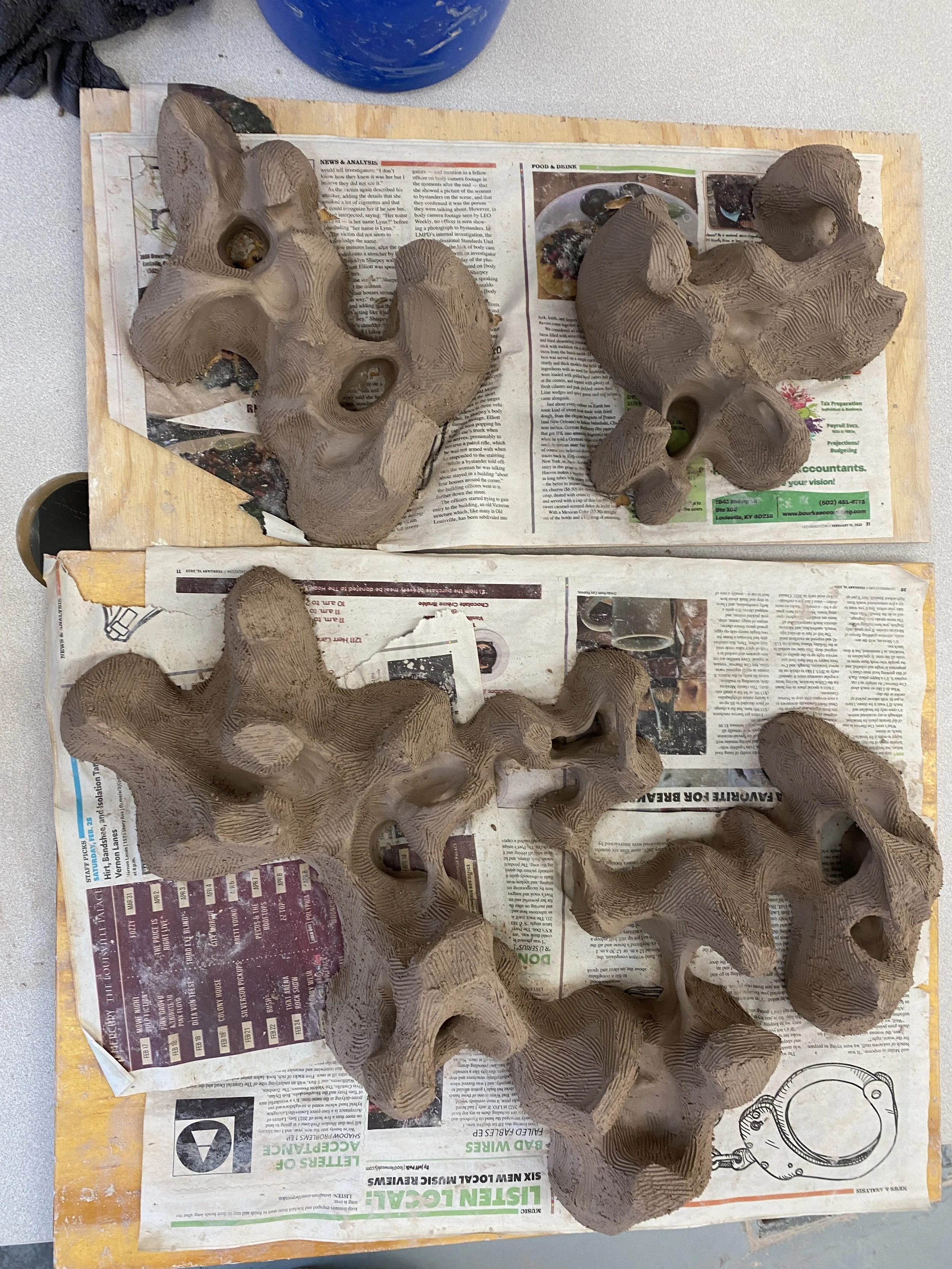 I feel that I’m on the right track with my making and feel organized in my studio practice. Besides ongoing visual and geological research, glaze testing, and clay body testing, I’ve divided my making into three major areas of exploration. I want to devote 1-2 weeks to each area at a time, cycling through these three areas for the rest of the term. One: my “Propriocepta” series; I intend to continue creating these forms with the ultimate goal of creating an immersive installation with them. This is what I’m focusing on this week and next. Two: developing my functional ware, from goblets and mugs to large bowls and vases. I got a lot of ideas and useful feedback during my critique and don’t want this to end up on the back burner just because I’m least confident about it. Three: larger forms and furniture. I’m most excited about my larger scale work and working towards functional sculptural furniture (namely stools and table bases).