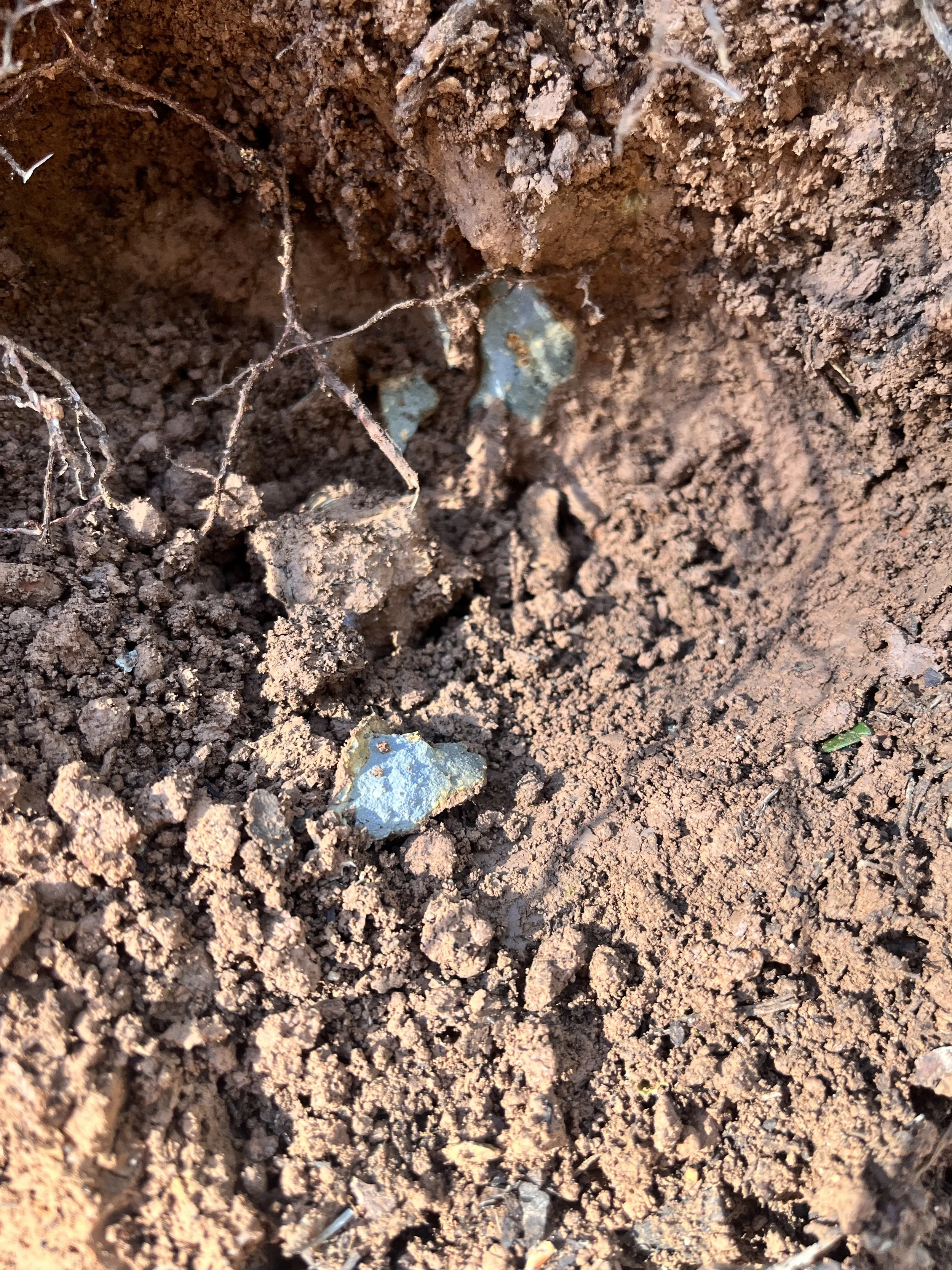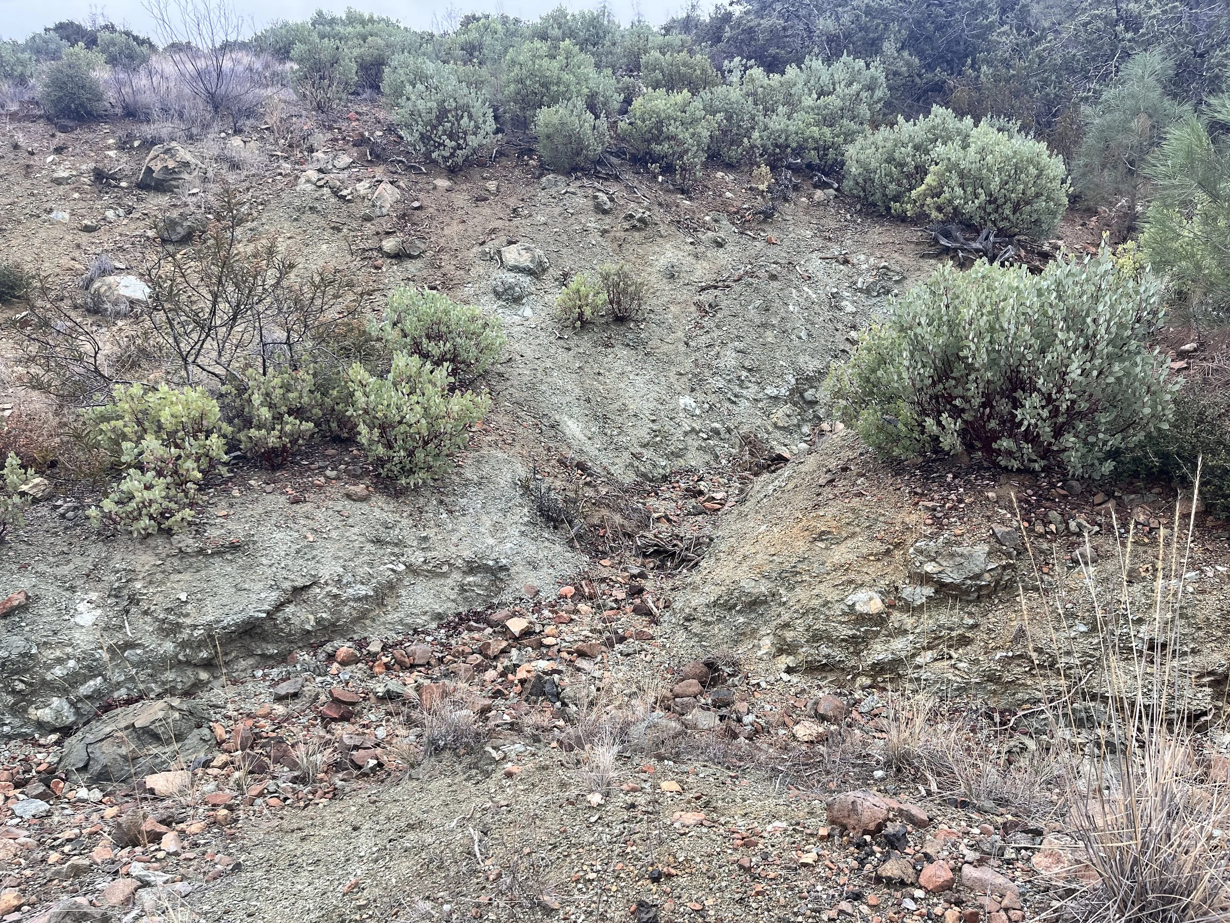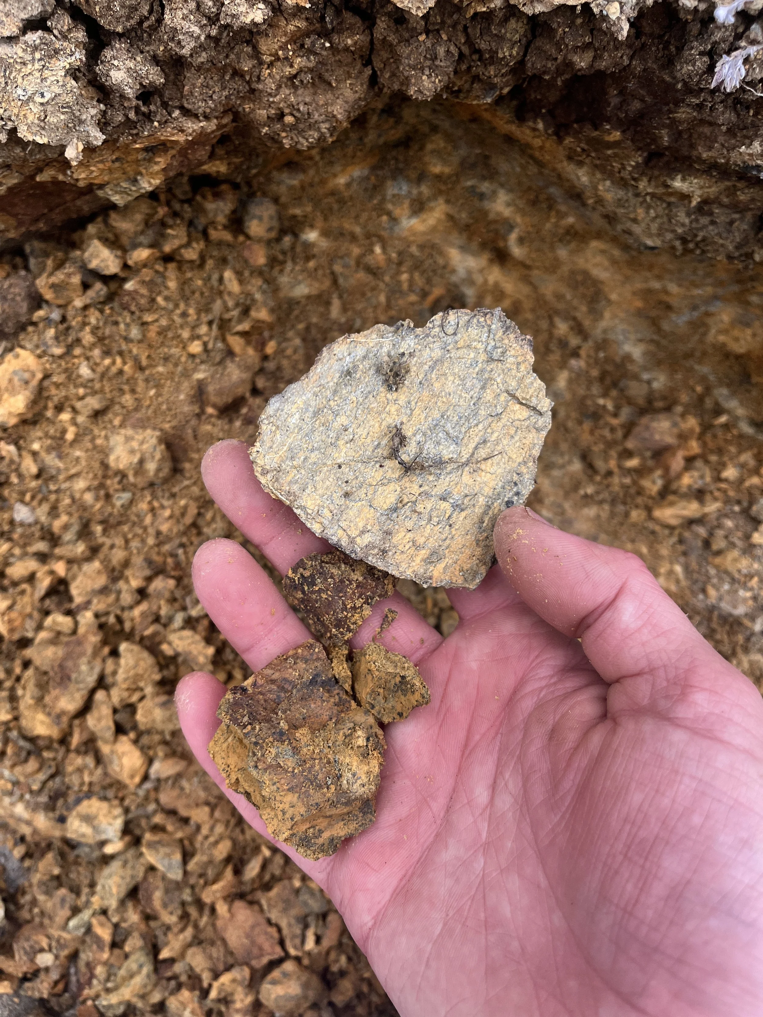 layers of yellow, green, and red soil along Sulphur Creek Rd. testing as potential raw materials/yellow ocre/copper source