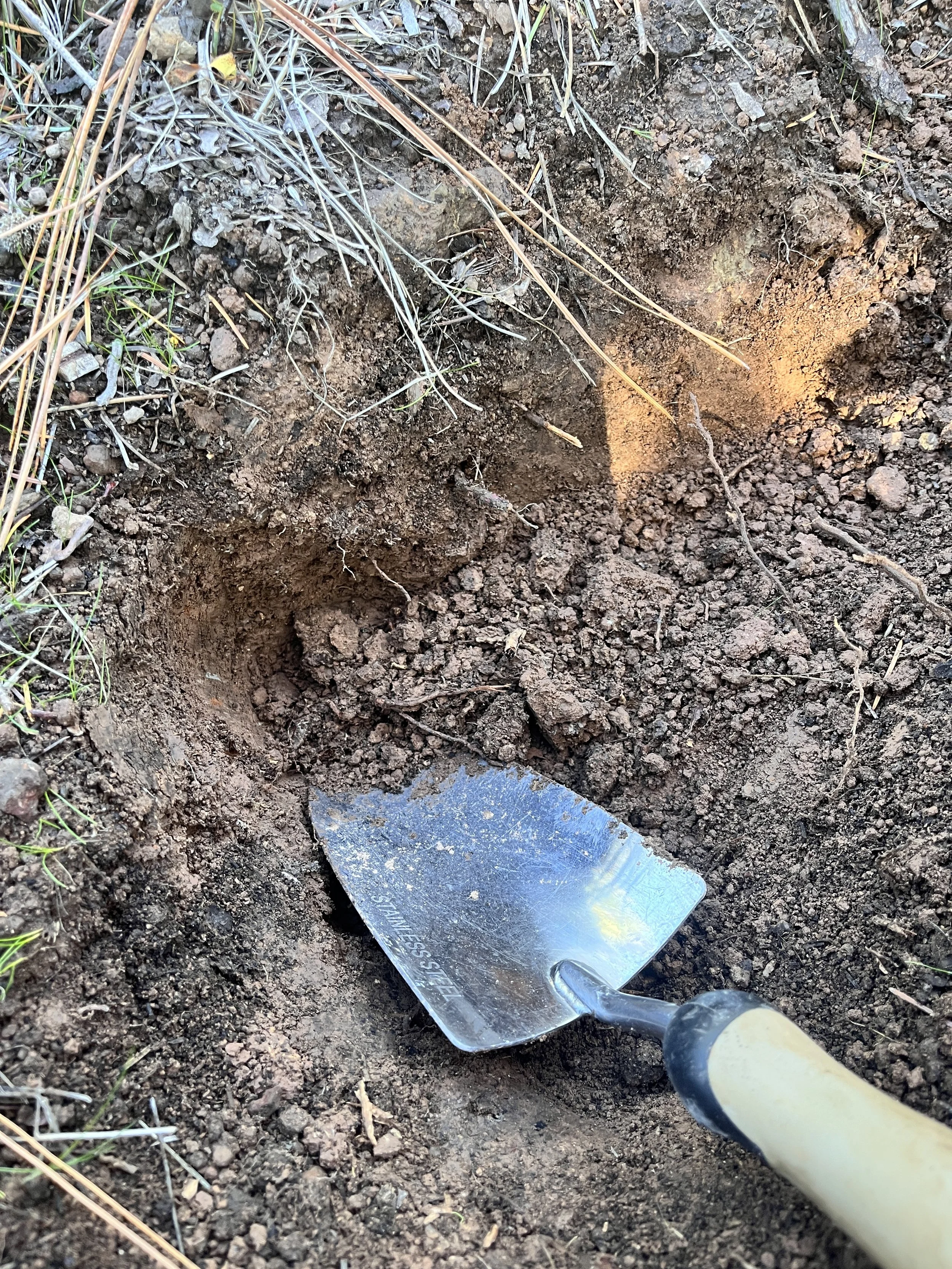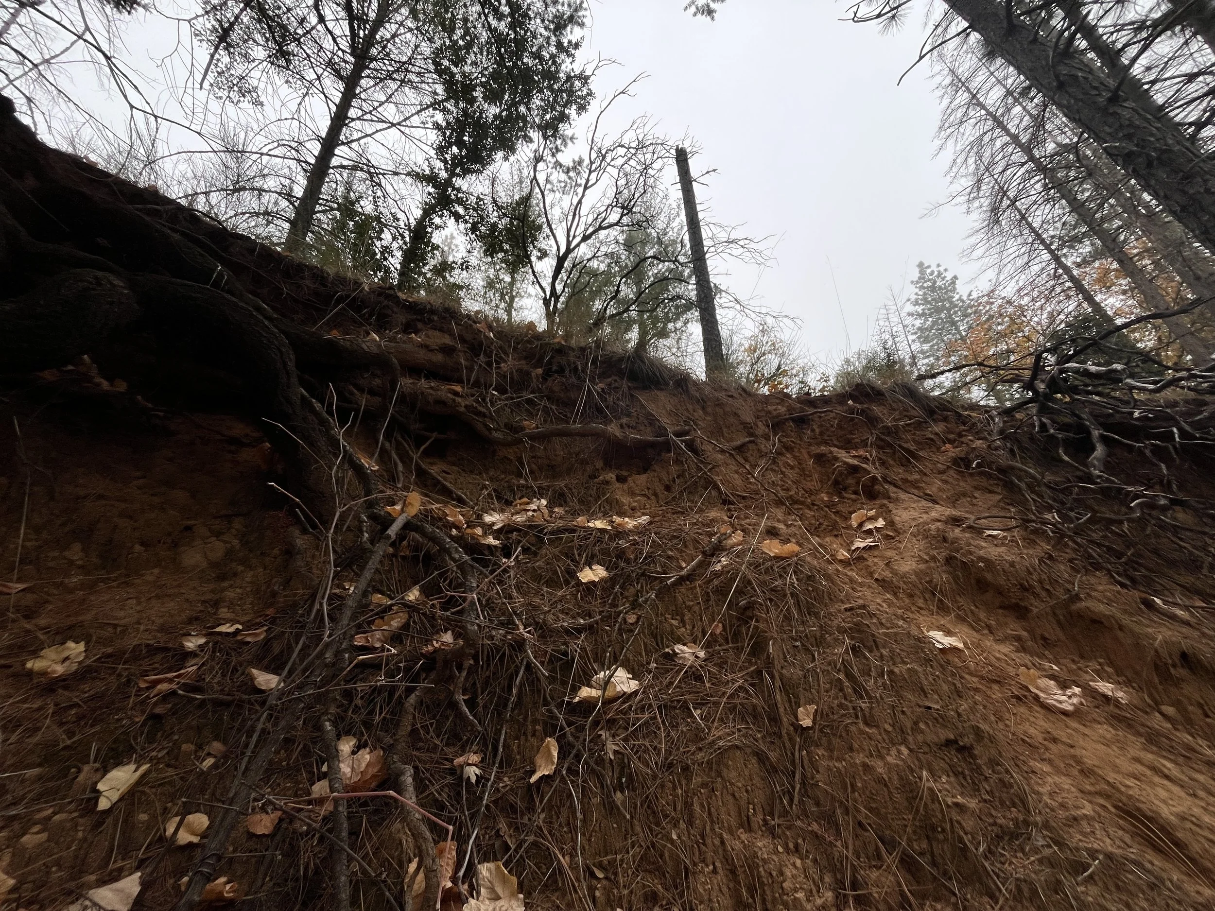 found along an exposed dirt cliff along the highway in an old growth redwood forest